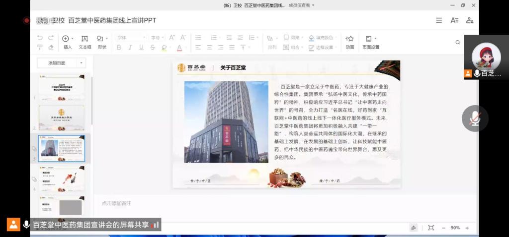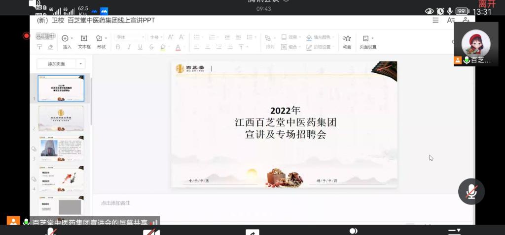 为切实做好公司毕业生就业工作,大力构建毕业生与用人单位的交流平台。由于疫情原因,药学系于2022年3月22日星期二下午1点30到3点30在通过腾讯会议线上开展了招聘宣讲会。百芝堂中医药集团、杭州中美华东制药、江西汇仁堂药品连锁有限公司三家企业来我系招聘人才,药学系22届毕业生参加了此次招聘宣讲会。这三家公司为我们提供了多个就业岗位,招聘专业有药学、中药学等相关专业。