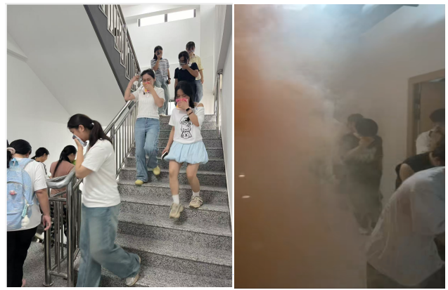 随着火警警报拉响,1450余名同学在辅导员和员工干部的引导下,用湿毛巾捂住口鼻,弯腰低姿,沿疏散通道迅速撤离,全程用时不到五分钟,全部到达指定集合地点。
