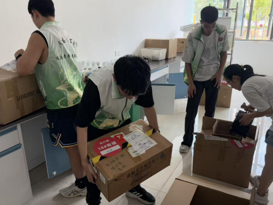 志愿者们把实验室物品初步拆箱拿出(欧阳熹原/摄)
