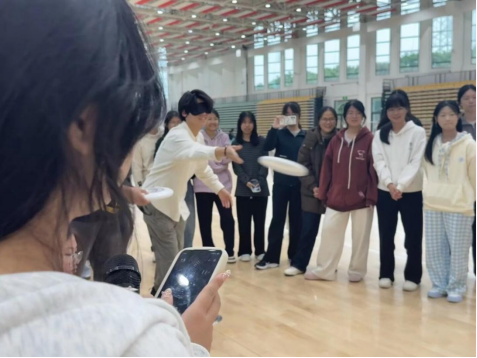 “蒙眼九宫飞盘挑战”成为团队协作的试金石。各小组需在蒙眼状态下,依靠队友精准指挥完成投掷任务。从初期的配合生疏到后期的默契协作,同学们在实践中学会信任与沟通,深刻领悟团队力量。