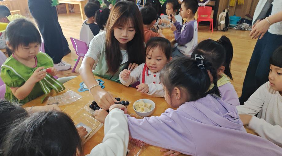 志愿者与小朋友共同制作糖葫芦(彭睿/摄)