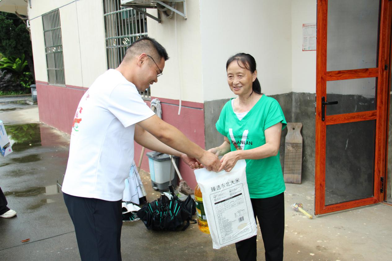 公司党委副书记刘永飞给贫困村民送大米和食用油(沈嘉玘/摄)