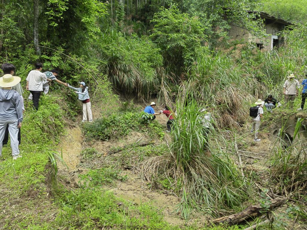 野外深山寻药之路并非一帆风顺,不仅考查同学们的对野外植物辨识的现学现用能力,登山道路上亦是对同学们体力与意志力的一次考验,在遇到实际困难时更需要团队的通力协作。在山中更是遇到了被山体滑坡冲垮的断路不时有同学跌倒,不时有同学落后。面对困难带教老师走在前,同学们紧跟在后。断路深坑内有看得见深水坑,更夹杂着可陷进小腿深的不可识别淤积泥沙地,同学们手牵手接力一步一步在断路底下通行,不少同学的鞋裤被泥沙尽染,但无一人掉队。前进!前进!向前进!同学们然挺起胸膛何惧风浪!前进!前进!向前进!同学们定能肩负民族的希望!
