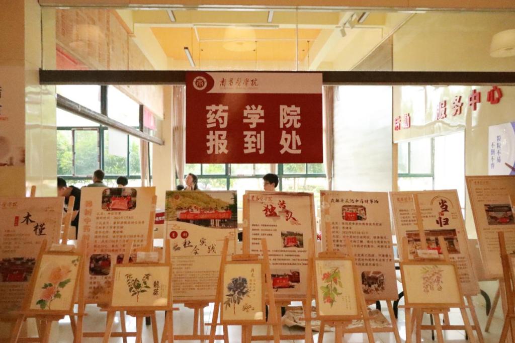 迎新现场展示了员工手绘中药图和暑期社会实践材料(谢子然/摄)