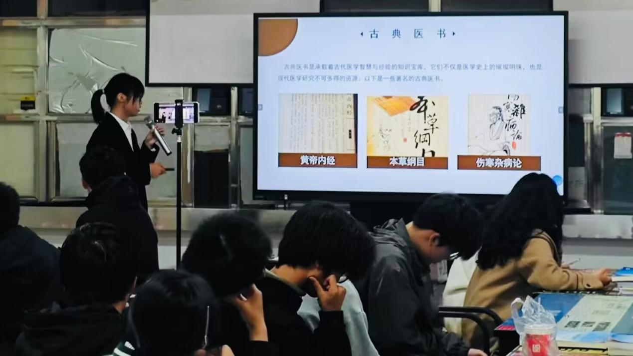 袁星雨同学介绍了中医药历史的进程,她结合当前中医在我国的发展走势,与同学们探讨了关于中医药未来发展的看法。陈思霓同学分享了关于中医药的基本概念与发展历程,先后介绍了中医药的疗效与科学性、中医药的传承和保护、中医药在现代生活中的应用以及中医药的未来发展前景方面。
