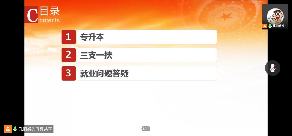 讲座伊始,孔老师从专升本、三支一扶、就业问题答疑这三个面展开讲述。近几年,国家出台了一系列优惠政策鼓励高校毕业生积极参加社会主义新农村建设、城市建设和应征入伍,孔老师向大家详细的介绍了“老员工志愿服务西部计划”“三支一扶”等目前国家引导高校毕业生基层就业政策,同学们也陆续提出了自己对于就业政策的疑问,孔老师对这些问题进行了详细的解释。